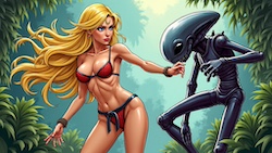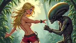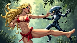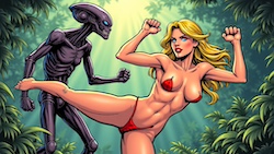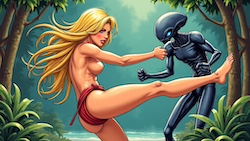 Bild(er): Female Warrior (Comic-Version), erstellt mit OpenArt.ai. Prompt: »A female naked warrior with long blonde hairs, blue eyes, red lips, big boops, nice butt, fights against an alien, in a jungle, using karate kicks, colored french comic style«. Modell: Flux.1 [dev], Style: None.
