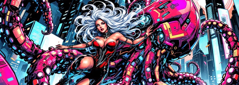 Bild: Octopussy, erstellt mit OpenArt.ai. Prompt: »Colored french comic style, a sexy female robot evades from a gigantic data octopus«. Modell: Flux.1 (Pro), Style: None.