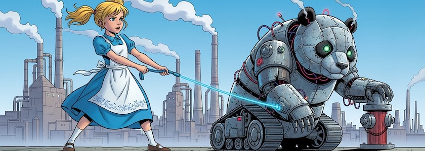 Bild: Bad, Bad Panda, erstellt mit OpenArt.ai. Prompt: »A little girl with blonde pigtails and a blue dress with a white apron is pulling a stubborn, cyberpunk-style tin panda on a leash. In the background, a factory with steaming chimneys. It’s broad daylight and the sun is shining. Colored DC Comic Style.«. Modell: Nano Banana.