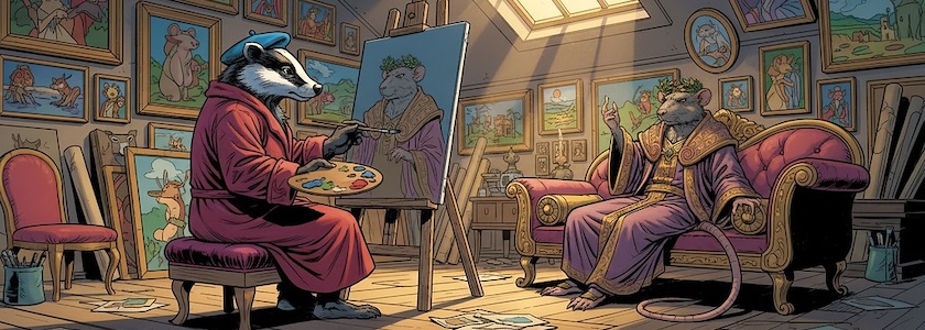 Bild: Der Dachs als Maler, erstellt mit OpenArt.ai. Prompt: »Illustration of a badger in a red dressing gown and a beret sits in an old-fashioned-looking studio at an easel and paints a picture. A rat in a flowing robe is posing as a model. Other colorful paintings hang on the walls. Light streams onto the easel through the skylight. Colored DC Comic style«. Modell: Nano Banana.
