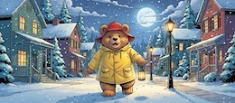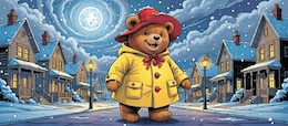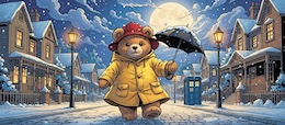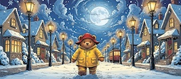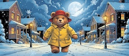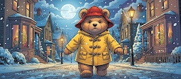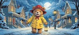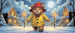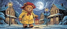 Illustration of a teddy bear wearing a bright yellow raincoat and a red sou’wester hat walks through a lit-up suburb at night. It’s snowing. The full moon shines through the clouds in the sky. Colored DC comic style.