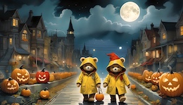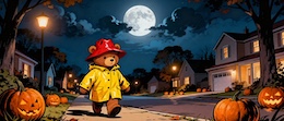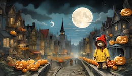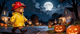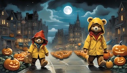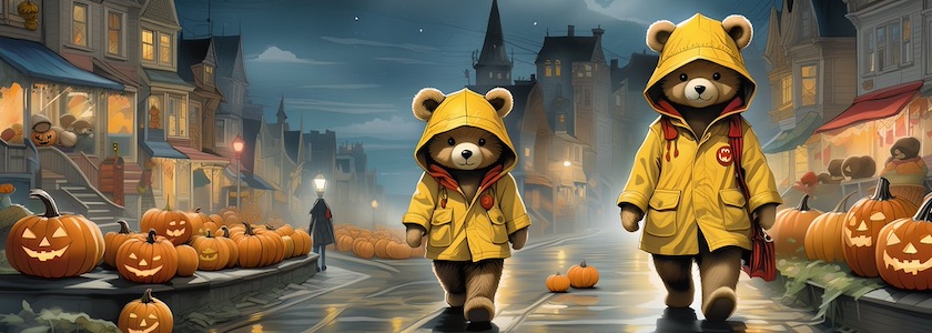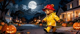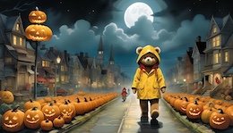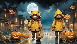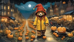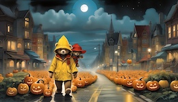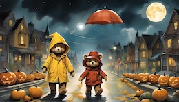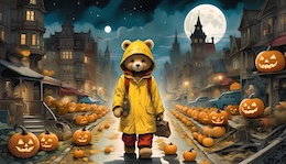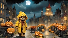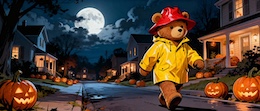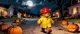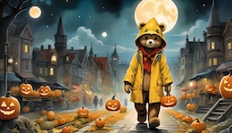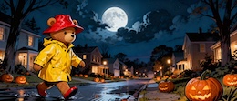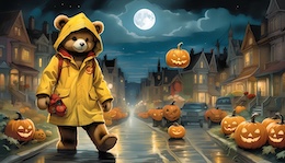 Illustration of a teddy bear wearing a bright yellow raincoat and a red sou’wester hat walks through a lit-up suburb at night. The streets are lined with Halloween pumpkins. The full moon shines through the clouds in the sky. Colored DC comic style.