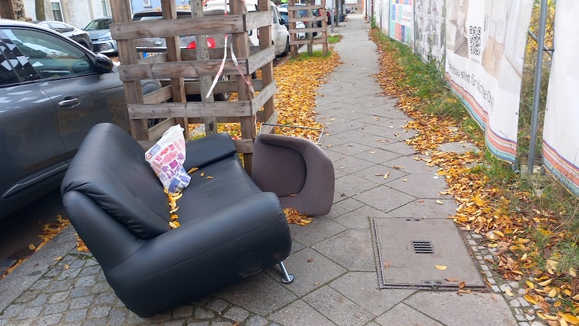 Dieses wunderschöne Ensemble aus einem befreiten Sofa und einem ebenfalls den bürgerlichen Fesseln entronnenem Sessel lief mir heute vormittag in der herbstlichen Neuköllner Bürgerstraße vor die Linse meines Smartphones. Ein weiteres nettes Fundstück für mein stetig wachsendes Photoalbum »Wohnsitz Neukölln«, das auf Flickr mittlerweile 1.878 Bilder umfasst.