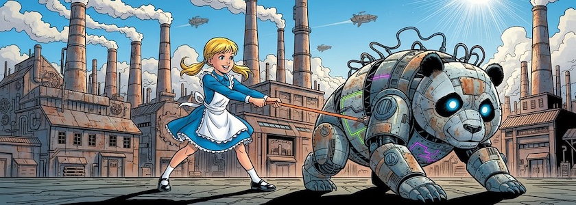 Bild: Bad, bad Panda, erstellt mit OpenArt.ai. Prompt: »A little girl with blonde pigtails and a blue dress with a white apron is pulling a cyberpunk-style tin panda on a leash. In the background, a factory with steaming chimneys. It’s broad daylight and the sun is shining. Colored DC Comic Style«. Modell: Nano Banana.