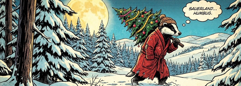 Bild: Ein Dachs zu Weihnachten im Sauerland, erstellt mit OpenArt.ai. Prompt: »A badger in a red dressing gown trudges through a snow-covered forest in the mountainous Sauerland region, carrying a decorated Christmas tree over one shoulder. It is night, and the full moon illuminates the scene. Colored DC Comic style«. Modell: Nano Banana Pro.