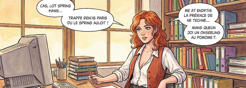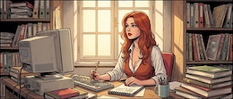 Bild: Office Woman (Nano Banana Pro), erstellt mit OpenArt.ai. Prompt: »Colored French Comic Style. A sexy young woman with long red hair, green eyes and red lipstick is sitting in an office at a desk in front of a monitor and a keyboard. She is wearing a white, open blouse with a low neckline and a rust-colored vest. She has a pencil in one hand. On the desk is an open notepad, a cup with writing utensils and a stack of books. There are shelves on the walls with many more books and files. The spring sun is shining through a window in the background«. Modell: Nano Banana Pro.