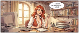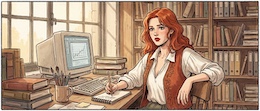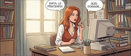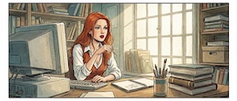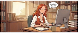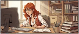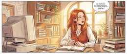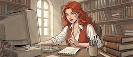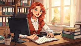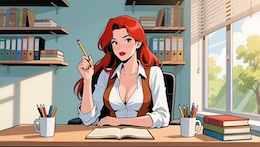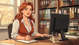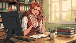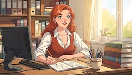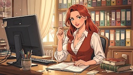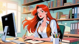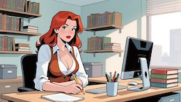 Colored French Comic Style. A sexy young woman with long red hair, green eyes and red lipstick is sitting in an office at a desk in front of a monitor and a keyboard. She is wearing a white, open blouse with a low neckline and a rust-colored vest. She has a pencil in one hand. On the desk is an open notepad, a cup with writing utensils and a stack of books. There are shelves on the walls with many more books and files. The spring sun is shining through a window in the background.