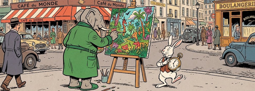 Bild: Der Elephant als Künstler, erstellt mit OpenArt.ai. Prompt: »Colored Franco-Belgian comic style. An elephant in a green dressing gown stands on the sidewalk at a busy city street corner, painting a brightly colored picture in front of an easel. A white rabbit wearing a vest and a large pocket watch on a chain watches him.« Modell: Nano Banana Pro.