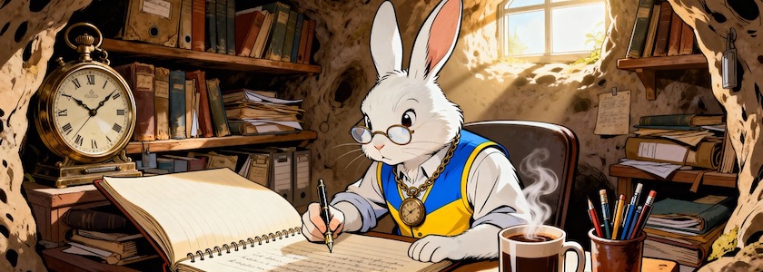 Bild: Kaninchen am Schreibtisch, erstellt mit OpenArt.ai. Prompt: »Colored DC comic style. A white rabbit wearing a blue and yellow vest and glasses sits at a desk in a rabbit burrow. It wears a large pocket watch on a chain. On the desk in front of the rabbit lies an enormous notebook, in which the rabbit is writing with an old-fashioned fountain pen. Next to it is a mug of steaming coffee. Writing utensils are in another mug. Many old books and files line the shelves all around the burrow. Sunlight shines through a window in the burrow wall.« Modell: Seedream 4.0.