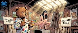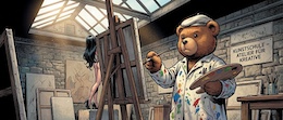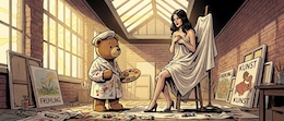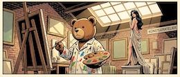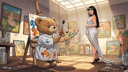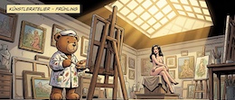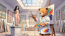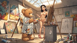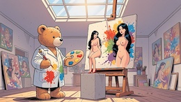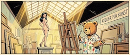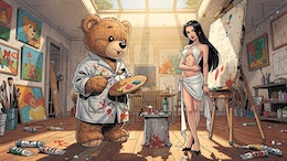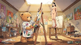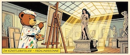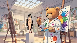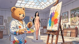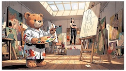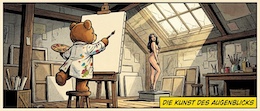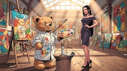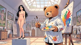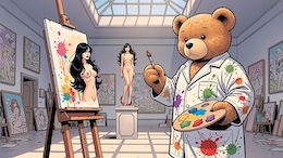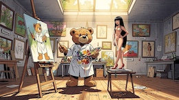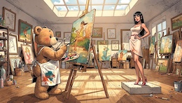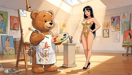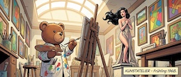 Bild: Der malende Teddy und sein Modell, erstellt mit Scenario. Prompt: »Colored DC comic style. A teddy bear in a white, paint-splattered smock stands before an easel, a paintbrush in its right paw and a palette in its left. In front of it, on a pedestal, stands a nude model with long, black hair, red lips, and high heels. It is a spacious studio with paintings on the walls. Spring sunshine streams through a large skylight. Language: German. No speech bubble.« Modell: Flux.2 (Flex).