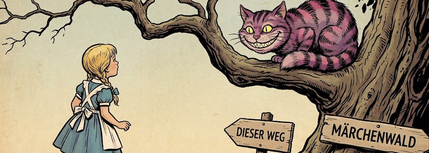 Bild: Alice und die Grinsekatze, erstellt mit Scenario. Prompt: »Little girl Alice, with blonde hair and pigtails, a white apron and a blue dress, stands in front of a tree, the Cheshire Cat sits on the tree and grins broadly at Alice. Colored classic comic style. Language: German. No speech bubbles.« Modell: Nano Banana Pro.