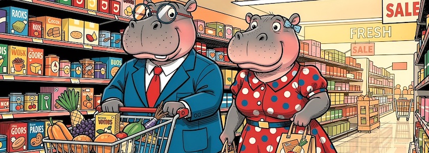 Bild: Hippo-Pärchen im Supermarkt, erstellt mit OpenArt.ai. Prompt: »An anthropomorphic hippopotamus couple, he wearing glasses, a blue jacket, a white shirt, and a red tie, she in a red, blue, and white polka-dotted dress, stroll through a supermarket. He pushes a shopping cart, she carries a bag. Colored classic comic style.« Modell: Flux.2 Pro.