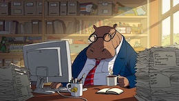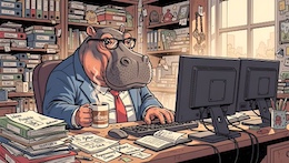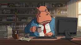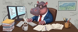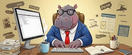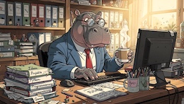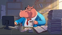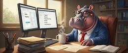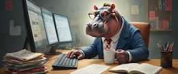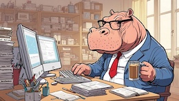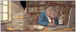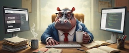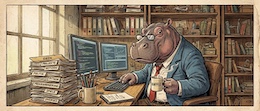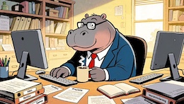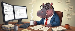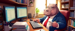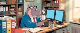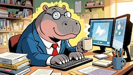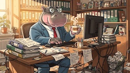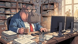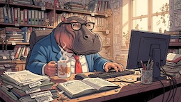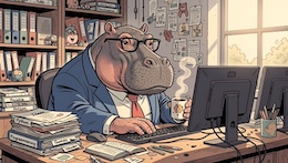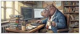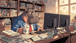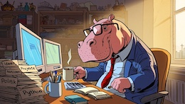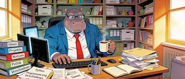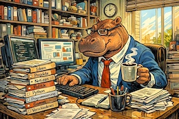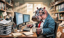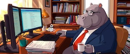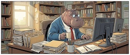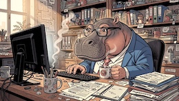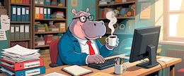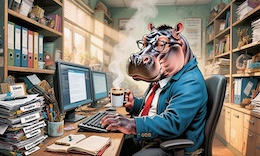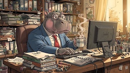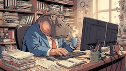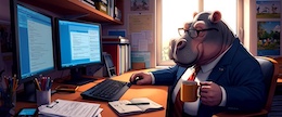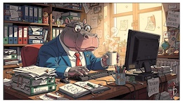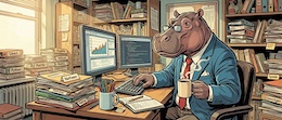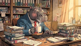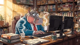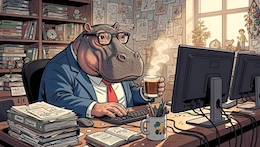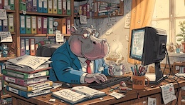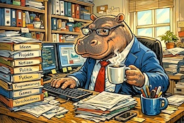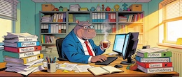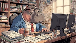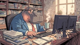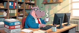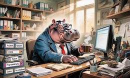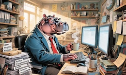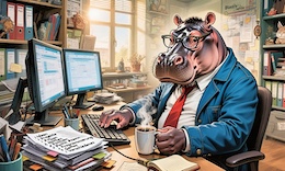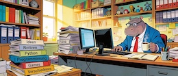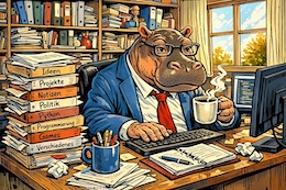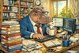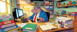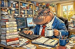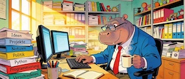 An anthropogenic hippopotamus wearing glasses, a blue jacket, a white shirt, and a red tie sits at a desk in front of a computer with two monitors, typing with its right hand. In its left hand, it holds a steaming mug of hot coffee. On the desk lies a stack of papers and files labeled with terms such as “Ideen,” “Projekte,” “Notizen,” “Politik,” “Python,” “Programmierung,” “Games,” and “Verschiedenes.” Next to the keyboard is a mug containing writing utensils and an open notebook. Behind the desk, along the walls, are tall shelves filled with files, books, and knick-knacks. Everything appears chaotic. Sunlight streams into the room through a window on the side. Colored classic comic style. Language: German. No speech bubbles. No text boxes.