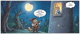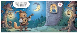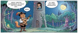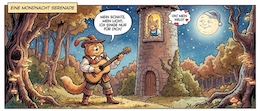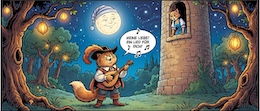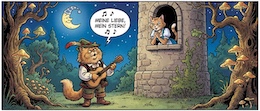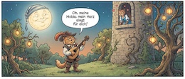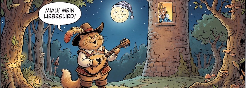 Bilder: Mondlicht-Serenade, generiert mit Scenario. Prompt: »An anthropomorphic Persian cat, wearing a feathered hat, vest, and boots, stands before a tall, solitary tower in a clearing in a fairytale forest. From the top window, a cat in a blue dress and white blouse gazes adoringly at the tomcat. The tomcat holds a guitar and meows a love song. Many strange trees surround the clearing. It is a balmy summer night, and the nightcap-wearing full moon smiles down from the sky. Colored Franco-Belgian comic style. Language: German.« Modell: Nano Banana Pro 🍌.