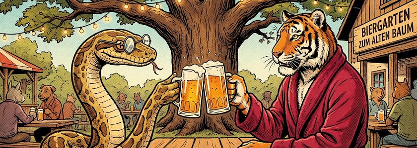 Bild: Python und Tiger unter einem Baum, generiert mit Scenario. Prompt: »A python wearing horn-rimmed glasses and a tiger in a red dressing gown sit under a giant tree in a beer garden and drink beer from large glasses. Colored American classic comic style. Language: German. No speech bubbles. No text boxes.« Modell: Nano Banana Pro 🍌.