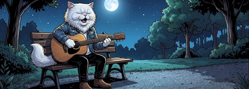 Bild: Momo spielt im Park Gitarre, generiert mit OpenArt.ai. Prompt: »@Momo plays guitar in a park at night in the moonlight. Colored Franco-Belgian comic style.« Modell: Character 2.0 mit Nano Banana Pro 🍌.