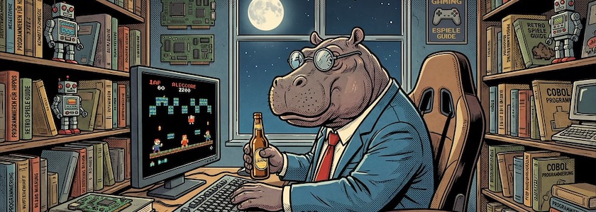 Bild: Jo Hippo als Gamer, erstellt mit OpenArt.ai. Prompt: »@Jo Hippo at a desk in front of a computer, in a wide gaming chair. A pixelated retro game is displayed on the monitor. One hand is on the keyboard, the other holds an open bottle of beer. All the walls are lined with shelves crammed with computer books and knick-knacks. The full moon shines through a large window in the background. Colored classic American comic style. Language: German. No speech bubbles, no textboxes.« Modell: Character 2.0 with Nano Banana Pro.