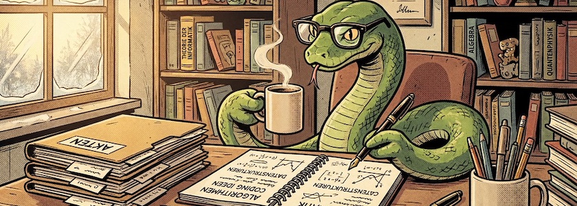 Bild: Python with a Jupyter Notebook, erstellt mit OpenArt.ai. Prompt: »Colored DC comic style. A green python wearing horn-rimmed glasses sits at a desk, a steaming cup of coffee in his hand. In front of him lies a notepad, covered in scribbles of ideas and sketches on mathematics and computer science. On the notepad rests an old-fashioned fountain pen. To the left is a stack of files, with slips of paper sticking out. To the right is a mug containing writing utensils. Shelves line the walls, filled with books and knick-knacks. Winter sunlight streams through a window on the side. Language: German, no speech bubbles. No Horns.« Modell: Nano Banana Pro.