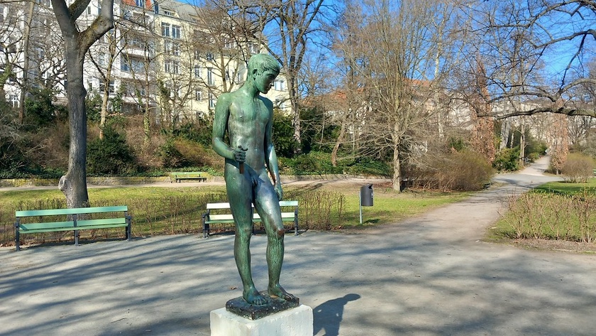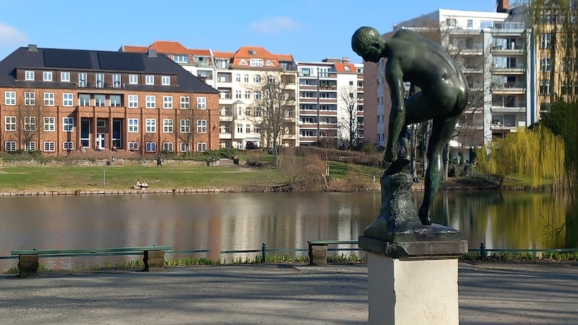 Der Weg führt nun weiter am See entlang nach Süden, vorbei an dem »Speerträger« von Bernhard Bleeker (1940, Aufstellung in der Nachkriegszeit). Der Speer ist ihm im Lauf der Jahre verlorengegangen.