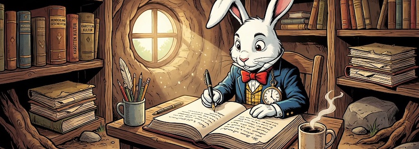 Bild: Rudi Rabbit, erstellt mit OpenArt. Prompt: »@Rudi Rabbit sits at a desk in a rabbit burrow. It wears a large pocket watch on a chain. On the desk in front of the rabbit lies an enormous notebook, in which the rabbit is writing with an old-fashioned fountain pen. Next to it is a mug of steaming coffee. Writing utensils are in another mug. Many old books and files line the shelves all around the burrow. Sunlight shines through a window in the burrow wall. Colored DC comic style. Language: German. No speech bubbles, no textboxes.« Modell: Character 2.0 with Nano Banana Pro.
