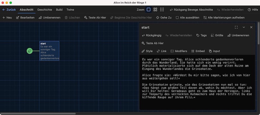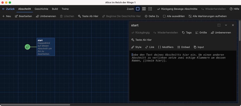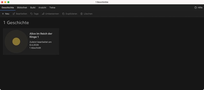 Als erstes legt Ihr auf dem Startbildschirm von Twine unter Geschichte > Neu eine neue Geschichte an. Ich habe sie »Alice im Reich der Ringe« genannt, aber das könnt Ihr nach Belieben verändern (Geschichte > Umbenennen).