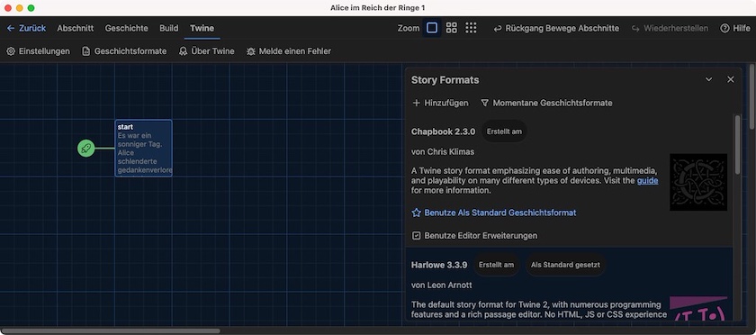 Die Storyformate könnt Ihr unter Twine > Geschichtsformate umstellen. Der Default zur Zeit ist Harlowe 3.3.x, für dieses Tutorial stellt aber bitte Chapbook 2.3.0 (oder größer) ein. Wenn das Storyformat einmal festgelegt ist, seid ihr für diese Geschichte daran gebunden, da die verschiendenen Storyformate bis auf wenige Befehle eine komplett unterschiedliche Syntax aufweisen. Bei einer nachträglichen Änderung des Storyformats müsst Ihr also sämtliche bisher erstellten Passagen ändern.