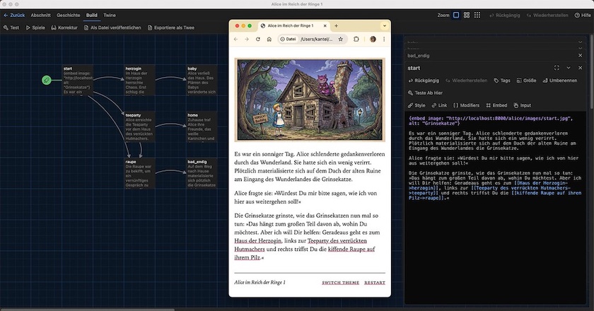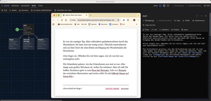 Im Browserfenster erscheint eine spielbare Version von Alice mit rot unterstrichenen, klickbaren Links (die momentan aber noch auf leere Passagen verweisen) und im Twine-Fenster sind wie von Geisterhand drei neue Passagen entstanden, mit den Titeln »Haus der Herzogin«, »Teeparty« und »Raupe«.