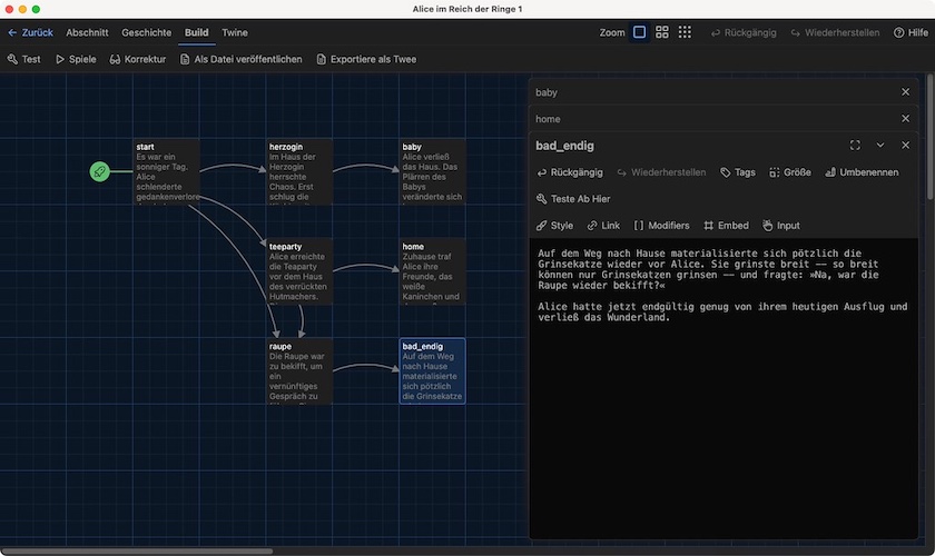 Alice beschloß, daß sie für heute genug habe und [[ging nach Hause->bad_endig]].Wenn Ihr jetzt wieder auf Euer Twine-Fenster schaut, werdet Ihr drei weitere, neue, aber noch leere Passagen finden, die Twine für Euch angelegt und mit Pfeilen versehen hat: baby, home und bad_ending. Ihr könnt sie zur besseren Übersicht erst einmal anordnen, wie im Screenshot oben und dann ebenfalls mit Text füllen.