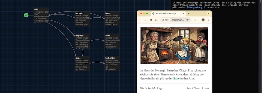 Ich möchte eine lang gehegte und lang angekündigte Idee realisieren und meine Reise ins Wunderland mit Twine und dem Storyformat Chapbook, die ich im August 2023 schon einmal (Teil 0.0, Teil 0.1, Teil 0.2) unternommen hatte, wieder aufnehmen und daraus ein Tutorial basteln. Grund für dieses Reloading ist zum einen, daß ich mittlerweile mehr über das Storyformat Chapbook gelernt habe und es in der akutellen Version auch ein paar Neuerungen gibt, aber zum anderen auch, daß ich dieses Tutorial nun mit Bildern aufpeppen kann, die von einer gekünstelten Intelligenz meines Vertrauens (in diesem Fall Nano Banana 2) generiert wurden. Denn seit Sommer 2023 hat die bildgenerierende Künstliche Intelligenz – damals noch in den Kinderschuhen – gewaltige Fortschritte erzielt.