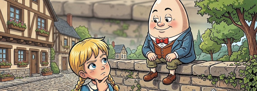 Bild: Alice und Humpel Pumpel, erstellt mit OpenArt. Prompt: »@Humpelpumpel sits on a wall in a picturesque little village. @Alice stands below, in front of the wall, looking at him friendly but questioningly. It is a beautiful, sunny day with few clouds in the sky. Colored Franco-Belgian comic style. Language German. No speech bubbles, no textboxes, no headlines. Close up.« Modell: Nano Banana 2.