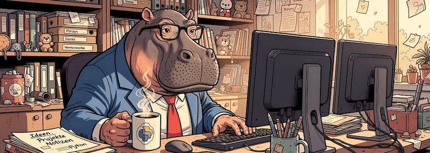 Bild: Jo Hippo, erstellt mit OpenArt. Prompt: »An anthropogenic hippopotamus wearing glasses, a blue jacket, a white shirt, and a red tie sits at a desk in front of a computer with two monitors, typing with its right hand. In its left hand, it holds a steaming mug of hot coffee. On the desk lies a stack of papers and files labeled with terms such as “Ideen,” “Projekte,” “Notizen,” “Politik,” “Python,” “Programmierung,” “Games,” and “Verschiedenes.” Next to the keyboard is a mug containing writing utensils and an open notebook. Behind the desk, along the walls, are tall shelves filled with files, books, and knick-knacks. Everything appears chaotic. Sunlight streams into the room through a window on the side. Colored classic comic style. Language: German. No speech bubbles. No text boxes.« Modell: Flux.2 Flex.