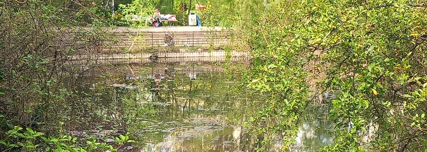 Im östlichen Bereich entstand ein von geschwungenen Wegen gesäumter Teich mit weißen und roten Seerosen, Wildenten und kleinen Fischen, zu denen sich bald auch Frösche und andere Amphibien gesellten.