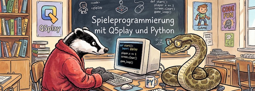 Bild: Q5play kann Python, erstellt mit Scenario. Prompt: »A badger in a red dressing gown and a python wearing horn-rimmed glasses are sitting together in a classroom in front of a computer, programming games. On the blackboard behind them, written in chalk, are the words: “Spieleprogrammierung mit Q5play und Python”. Colored Franco-Belgian comic style. Language: German. No speech bubbles, no textboxes, no headlines.« Modell: Nano Banana 2.
